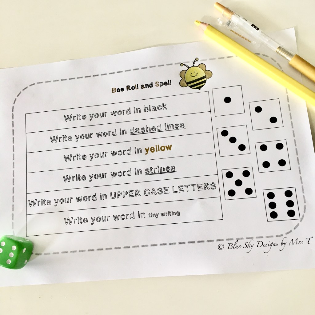 A lot of spelling practice involves repetition. So, why not make this repeated practice more interesting by adding an element of chance? In ‘roll & spell’ students roll the die to determine how they write out their spelling word. As you can see in the image below, you can easily incorporate themes into this activity too. You can find a copy of this template here.